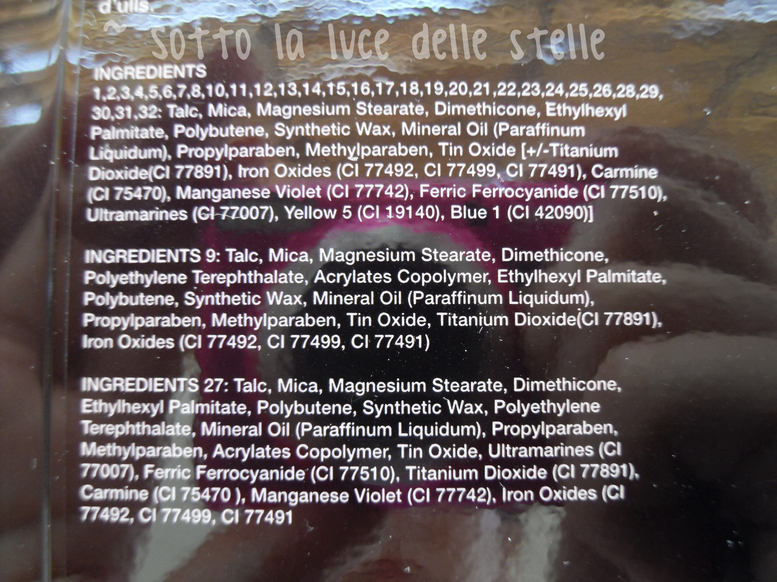 Come già anticipato, sul retro della confezione è presente l'inci degli ombretti (che approfondirò nel post della review specifica), indicato in base al "numero" assegnato ai singoli colori.